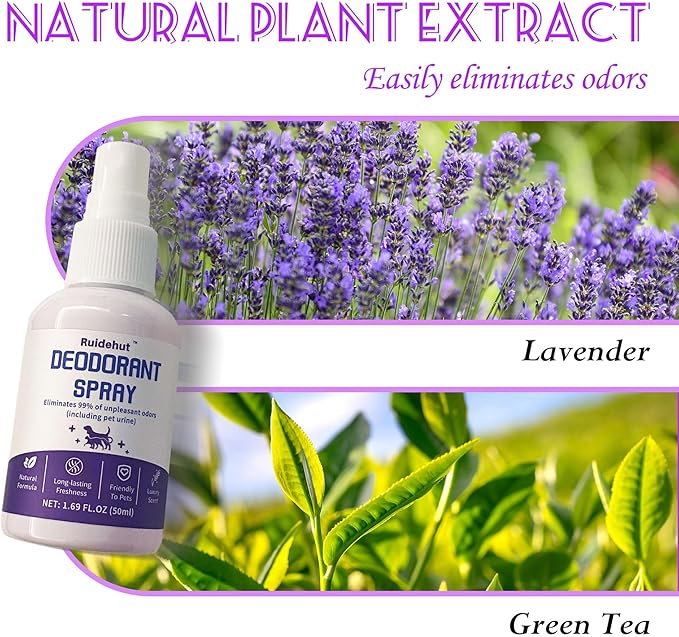 - HELP CHANGE BAD HABITS: The natural extracts in the Dog Deodorant Spray quickly eliminate urine, feces, vomit, and other pet-generated odors that may cause your dog to defecate in the wrong place.The lavender scent prevents your dog from smelling familiar odors and helps with subsequent use of the dog potty training spray.