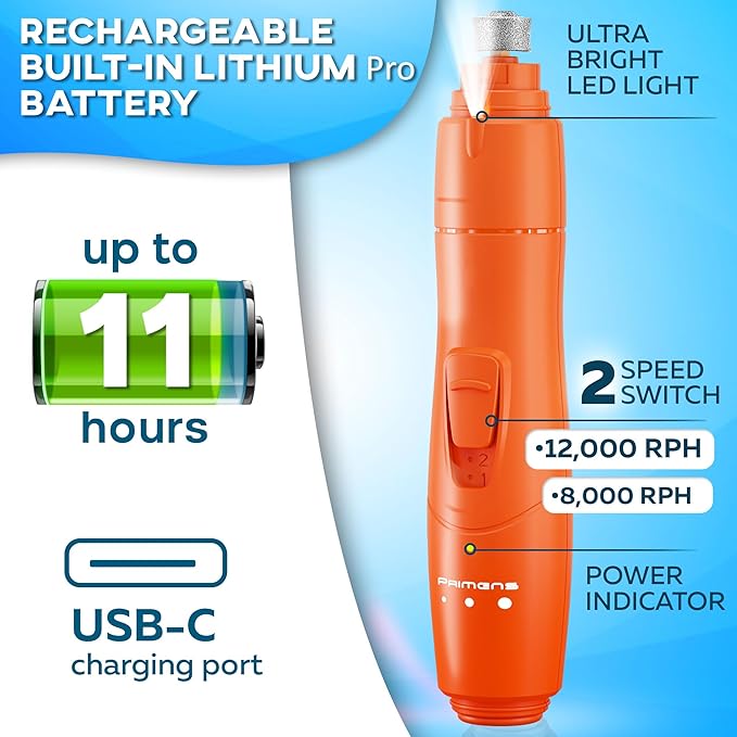 - Forget about low battery after the first use or even worse - during the nail trimming process. Our rechargeable dog nail grinder works up to 11 hours on a single charge. Because it’s cordless, you can use this electric dog nail grinder from anywhere. Find the place where your pet feels safe and comfy, and finally do that trimming thing without stress.