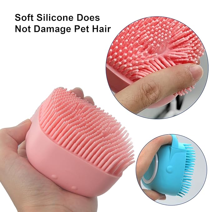 Pet Bath Brush Scrubber, Soft Silicone Shampoo Dispenser with Shower Grooming & Adjustable Ring Handle for Short/Long Haired Dogs and Cats, Pink+Blue 1PCS
