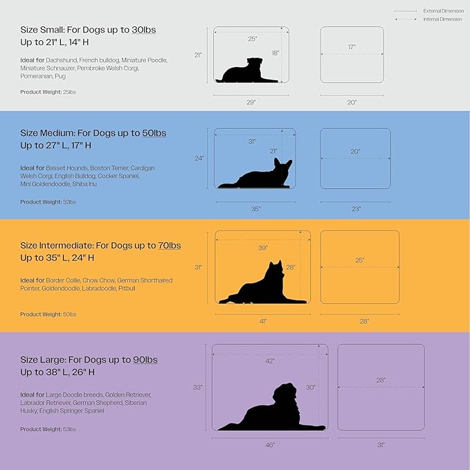 - IS THIS THE RIGHT SIZE FOR MY DOG?: Ideal for dogs up to 20" tall, such as Basset Hounds, Boston Terriers, Cardigan Welsh Corgis, English Bulldogs, Cocker Spaniels, Mini Goldendoodles, and Shiba Inus. Internal dimensions: 32"L x 20"W x 22"H. External dimensions: 35"L x 23"W x 24"H.