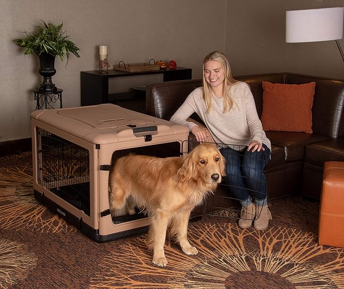 Pet Gear “The Other Door” 4 Door Steel Crate for Dogs/Cats with Garage-Style Door, Includes Plush Bed + Travel Bag, No Tools Required, Beige