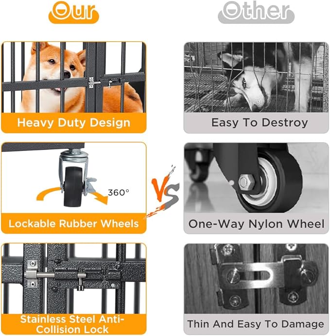 - [EASY ASSEMBLY AND TRANSPORTATION] Experience hassle-free assembly with our heavy-duty dog kennel, which comes mostly pre-assembled. You can effortlessly set it up in just 10 minutes, even as a single person. The 360-degree swivel caster wheels with brakes ensure easy maneuverability and safety when moving the crate.