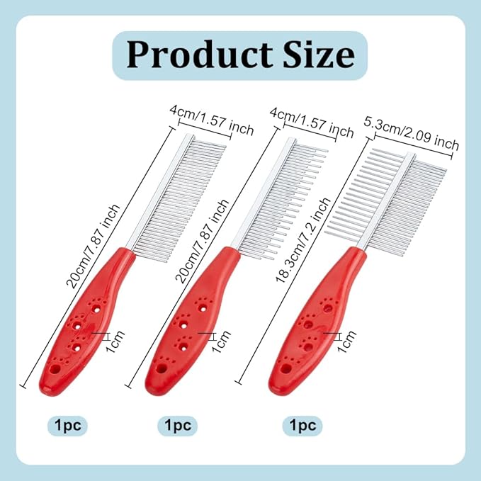 - Size Details--The size of 2 pcs one-sided pet combs are 200x40x10mm/7.87x1.57x0.39 inch, and the size of 1 pc two-sided pet comb is 183x53x10mm/7.2x2.09x0.39 inch, which is moderate in size and convenient to use