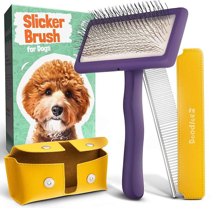 - [COMPLETE GROOMING SET] Comes with a dog slicker brush and a comb for goldendoodles, neatly stored in two vegan leather cases. This doodle brush for dogs is easy to use and doubles as an essential goldendoodle brush to keep coats tangle-free.