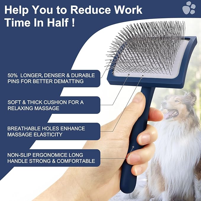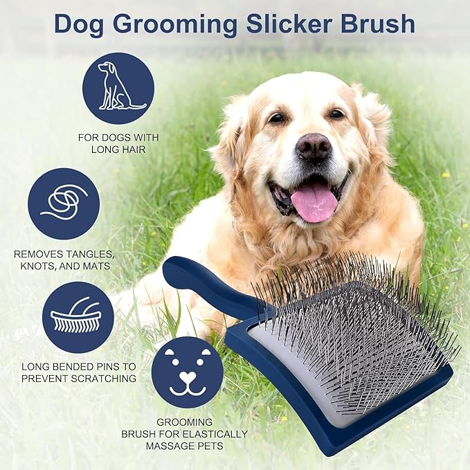 - ★【GREAT FOR GETTING OUT TANGLES AND MATS】: Golden doodle must haves- Poodle grooming kit. This slicker brush for dogs is specially designed for dogs with thick double coats or curly hair, such as Goldendoodles, Poodles, and Shih Tzus. Suitable for grooming long ,thick and curly coats. Its long, dense pins effectively penetrate the topcoat to groom the undercoat and prevent matting, making it ideal for pets with dense or easily tangled fur. Whether you need a slicker brush for Goldendoodles, a poodle brush for grooming, or a long-haired brush for dogs, this tool delivers exceptional results.