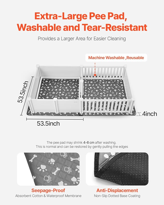 - Oversized Pee Pads (2 Included): Each pad measures 53.5x53.5 inch / 1360x1360 mm, with absorbent cotton and waterproof lining to block leaks. The anti-slip backing keeps the pad in place. Machine washable and reusable. Pads may shrink 4 to 6 cm after washing—gently stretch the edges to restore