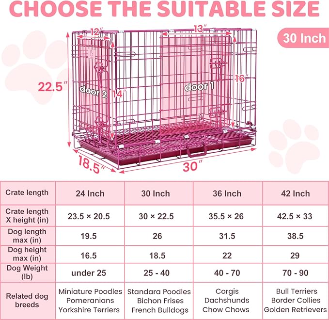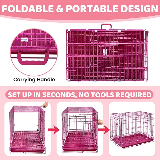 - Foldable Design & Easy Storage: The pink dog crate eliminates the tedious installation steps, makes it easy to install within 30 seconds with no tools required. Simple to assemble and dismantle for compact storage when not in use. Conveniently fold flat for transport and top handle for comfortable carrying