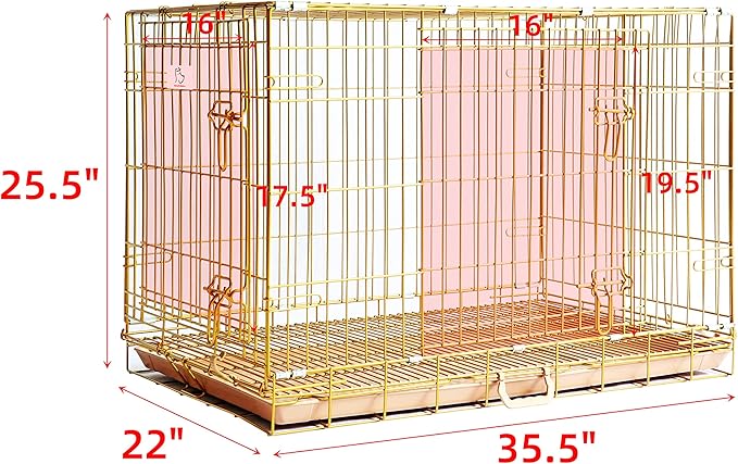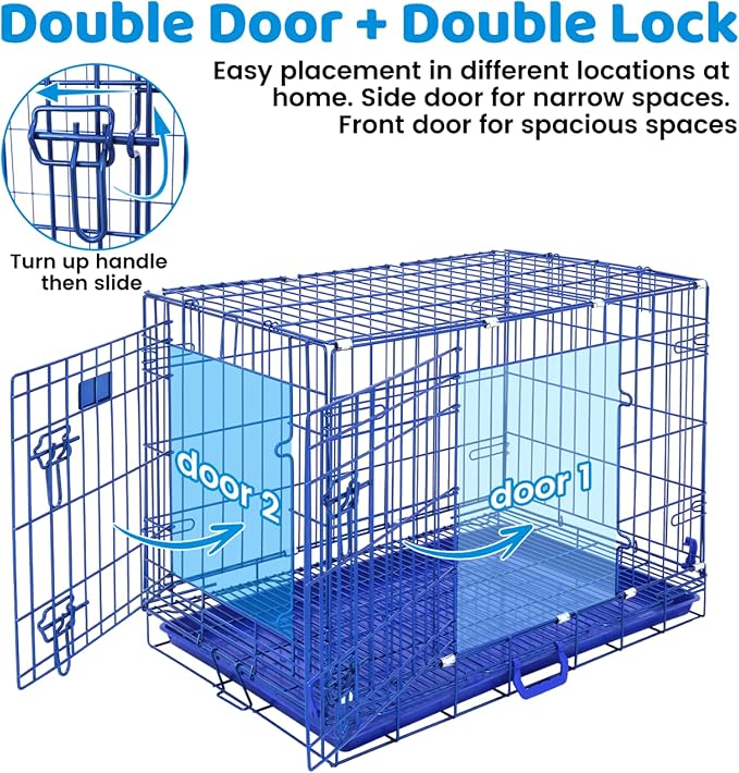 - Double Doors & Dual Locks: Featuring two large doors with low thresholds, on the front and side, for easy access. Convenient for interaction, feeding, and cleaning waste. Each door of foldable dog crate has two escape-proof slide-bolt latches that turn upward and slide to open, preventing your clever pet from escaping