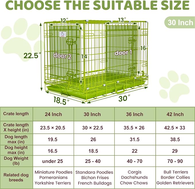 - Size & Fit: The 30"L x 18.5"W x 22.2"H dog cage for small dogs fits dogs up to 26" long, 18.5" tall, and weighing 25–40 lbs—ideal for medium-small breeds like French Bulldogs and Bichon Frises. The 42.5"L x 27.4"W x 33"H large crate accommodates dogs up to 38.5" long, 29" tall, and 70–90 lbs, making it perfect for large breeds such as German Shepherd and Golden Retrievers